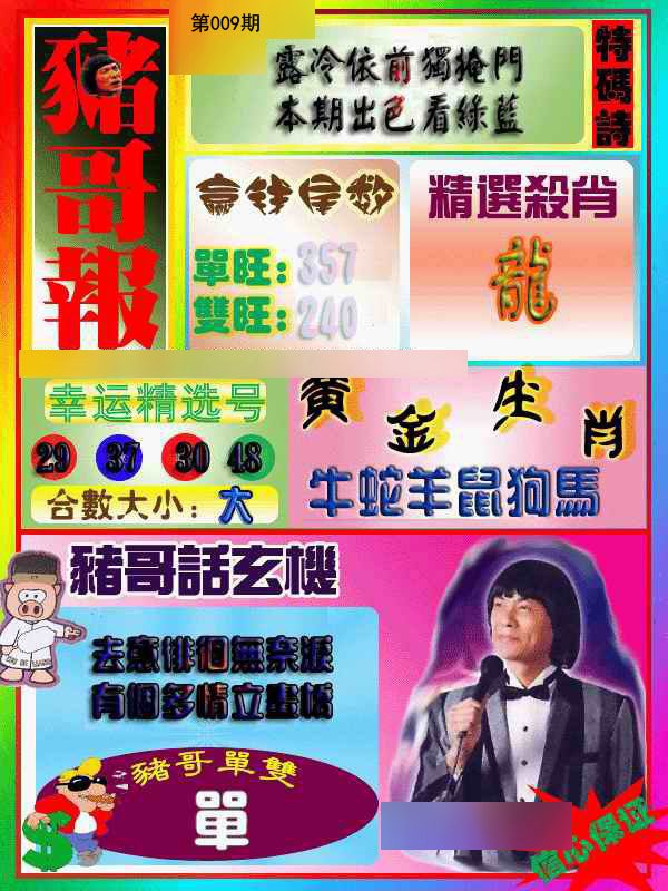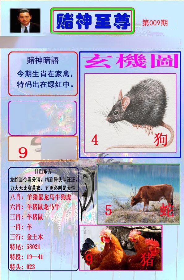 009期:复式连肖【牛兔猴鼠狗虎】 |