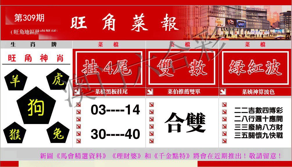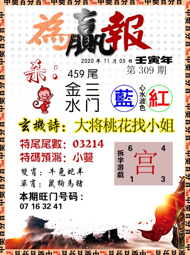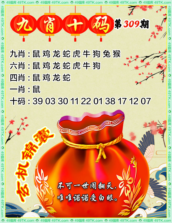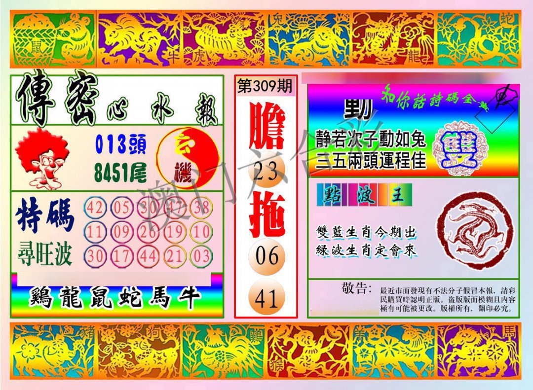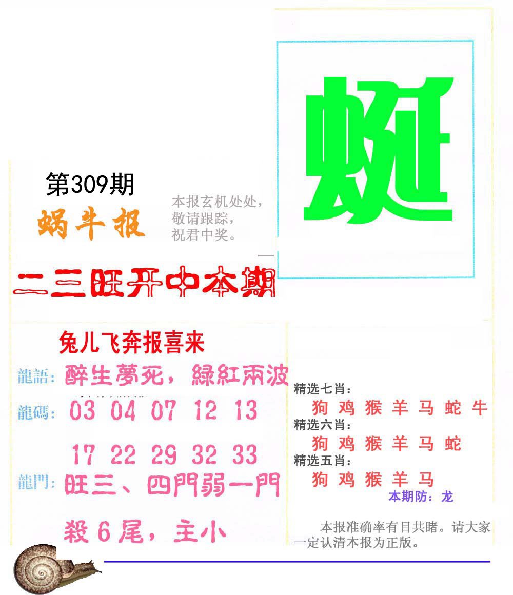 309期:复式连肖【猴鸡鼠龙马虎】 |